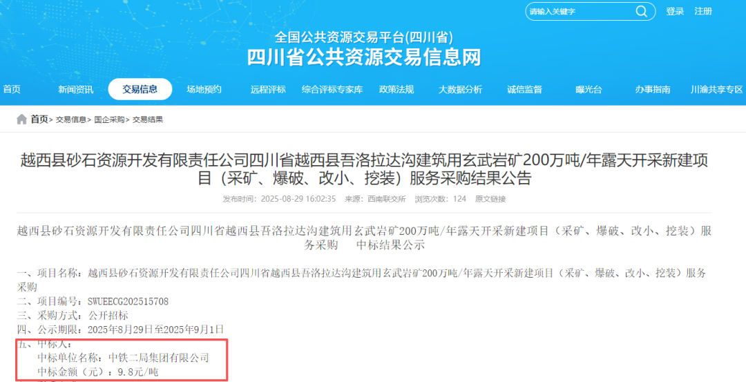 近日,四川省公共資源交易信息網(wǎng)發(fā)布涼山彝族自治州越西縣砂石資源開發(fā)有限責(zé)任公司建筑用玄武巖礦200萬噸/年露天開采新建項目(采礦、爆破、改小、挖裝)服務(wù)采購中標(biāo)結(jié)果,中鐵二局集團(tuán)有限公司成功中標(biāo),中標(biāo)報價為9.8元/噸。