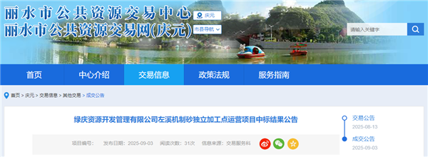 近日,浙江省麗水市公共資源交易網(wǎng)發(fā)布綠慶資源開發(fā)管理有限公司左溪機(jī)制砂獨(dú)立加工點(diǎn)運(yùn)營項(xiàng)目中標(biāo)結(jié)果,麗水承宜建筑用石加工有限公司、麗水巾子峰建設(shè)有限公司(聯(lián)合體)以37.2元/方成功中標(biāo)該項(xiàng)目。