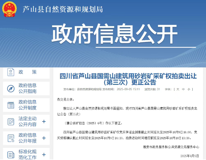 近日, 蘆山縣自然資源和規(guī)劃局發(fā)布蘆山縣國需山建筑用砂巖礦采礦權(quán)拍賣出讓(第三次)更正公告,根據(jù)出讓公告內(nèi)容,原定于2025年9月10日的拍賣活動順延至2025年10月10日。