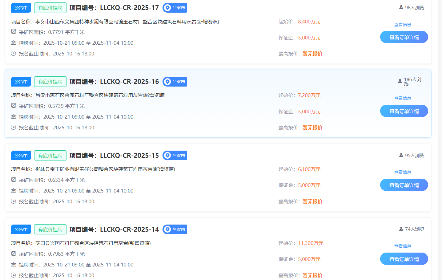 近日,山西呂梁市規(guī)劃和自然資源局集中發(fā)布12宗砂石類采礦權掛牌出讓公告。項目均為整合區(qū)塊內新增、空白資源,覆蓋交口(4宗)、中陽(3宗)、孝義(2宗)、離石、柳林、交城各1宗等6個縣區(qū),涉及白云巖、石灰?guī)r兩大主流礦種。合計資源儲量13.6億噸,掛牌起始價10.59億元,均價約0.78元/噸。