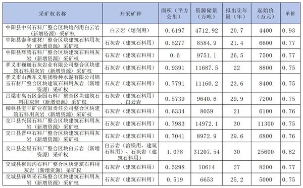 9、孝義市巍巍石灰?guī)r業(yè)有限公司整合區(qū)塊建筑石料用灰?guī)r(新增資源)采礦權:礦區(qū)面積0.9391平方公里,資源儲量11687.5萬噸,擬出讓年限22年,起始價8800萬元。