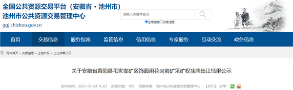 9月24日,安徽省池州市青陽縣毛家垅礦區(qū)飾面用花崗巖礦采礦權(quán)被當?shù)厮狡?mdash;—青陽縣創(chuàng)新物流有限公司成功競得。該礦查明資源總量1515.85萬方,生產(chǎn)規(guī)模55萬方/年,擬出讓年限26.3年,成交價4.2億元,溢價率100%(起始價2.1億元),資源價款約27.7元/方。