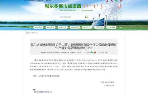 9月24日,鄂爾多斯市能源局發(fā)布《關(guān)于內(nèi)蒙古智能煤炭有限責(zé)任公司麻地梁煤礦生產(chǎn)能力等要素信息的公告》。公告顯示,“麻地梁煤礦已完成化解產(chǎn)能任務(wù)并取得1000萬噸/年環(huán)境報告書批復(fù)。”這標(biāo)志著麻地梁煤礦已全部完成1000萬噸/年產(chǎn)能核增手續(xù)辦理,取得了千萬噸產(chǎn)能依法合規(guī)生產(chǎn)資質(zhì)。