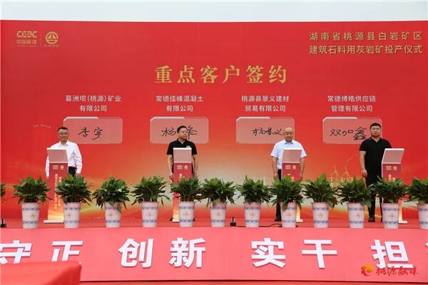 9月30日,湖南省常德市桃源縣白巖礦區(qū)建筑石料用灰?guī)r礦項(xiàng)目投產(chǎn)儀式在九溪鎮(zhèn)舉行。葛洲壩集團(tuán)第二工程有限公司黨委書(shū)記/董事長(zhǎng)周獻(xiàn)忠宣布投產(chǎn)。桃源縣委副書(shū)記/縣長(zhǎng)馬吉云、葛洲壩二公司黨委委員/副總經(jīng)理龍勝分別致辭。葛洲壩(桃源)礦業(yè)有限公司董事長(zhǎng)/總經(jīng)理李宇介紹項(xiàng)目建設(shè)情況并代表葛洲壩(桃源)礦業(yè)有限公司與常德佳峰混凝土有限公司、桃源縣景義建材貿(mào)易有限公司、常德博皓供應(yīng)鏈管理有限公司現(xiàn)場(chǎng)簽約。