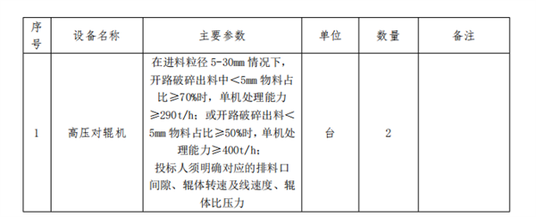 其中,高壓對輥機(jī)采購2臺,要求在進(jìn)料粒徑5-30mm情況下,開路破碎出料中<5mm物料占比≥70%時,單機(jī)處理能力≥290噸/時;或開路破碎出料<5mm物料占比≥50%時,單機(jī)處理能力≥400噸/時;投標(biāo)人須明確對應(yīng)的排料口間隙、輥體轉(zhuǎn)速及線速度、輥體比壓力。