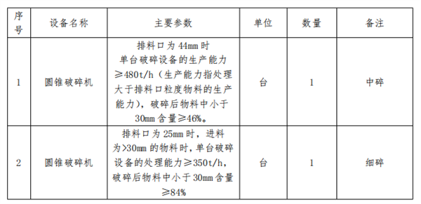 圓錐破碎機(jī)采購2臺,其中,1臺排料口為44mm時單臺破碎設(shè)備的生產(chǎn)能力≥480/時(生產(chǎn)能力指處理大于排料口粒度物料的生產(chǎn)能力),破碎后物料中小于30mm含量≥46%,用于中碎;另外1臺排料口為25mm時,進(jìn)料為>30mm的物料時,單臺破碎設(shè)備的處理能力≥350/時,破碎后物料中小于30mm含量≥84%,用于細(xì)碎。