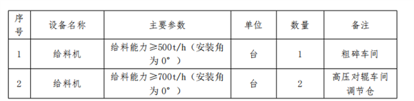 給料機(jī)采購3臺,其中,1臺給料能力≥500/時,用于粗碎車間;另外2臺給料能力≥700/時,用于高壓對輥車間調(diào)節(jié)倉。