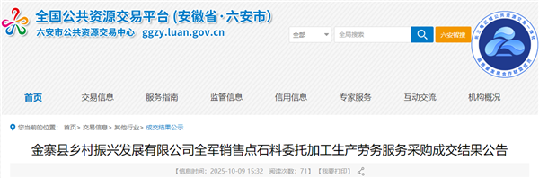 日前,安徽省六安市公共資源交易中心發(fā)布金寨縣鄉(xiāng)村振興發(fā)展有限公司全軍銷售點石料委托加工生產(chǎn)勞務(wù)服務(wù)采購成交結(jié)果公告。中標(biāo)供應(yīng)商為金寨縣金江礦業(yè)有限公司,成交單價25.24元/噸,服務(wù)時間暫定自合同簽訂之日起1年。