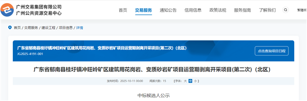 10月11日,廣東省郁南縣桂圩鎮(zhèn)沖旺嶺礦區(qū)建筑用花崗巖、變質(zhì)砂巖礦項(xiàng)目運(yùn)營(yíng)期剝離開采(南區(qū)、北區(qū))項(xiàng)目公示中標(biāo)候選人,水電七局均排名第一,投標(biāo)報(bào)價(jià)共超14億元。