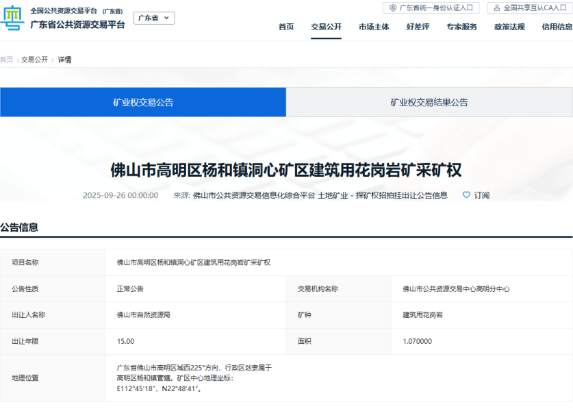 近日,廣東佛山市公共資源交易中心以網(wǎng)上掛牌形式出讓佛山市高明區(qū)楊和鎮(zhèn)洞心礦區(qū)建筑用花崗巖礦采礦權(quán)。該礦權(quán)礦區(qū)位于廣東省佛山市高明區(qū)城西225°方向,建筑用花崗巖保有資源量礦石總量為4080.2萬立方米,出讓年限為15年,年生產(chǎn)規(guī)模為300萬立方米,起始價為27580.57萬元。