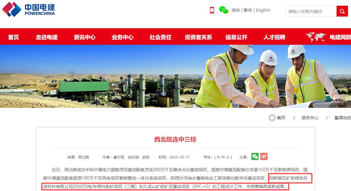 近日,中國電建集團(tuán)西北勘測設(shè)計(jì)研究院有限公司成功中標(biāo),陽新媧石礦投綠色環(huán)保材料有限公司2000萬噸/年骨料制砂項(xiàng)目(三期)和九龍山礦段礦區(qū)建設(shè)項(xiàng)目(EPC+O)的工程設(shè)計(jì)工作。