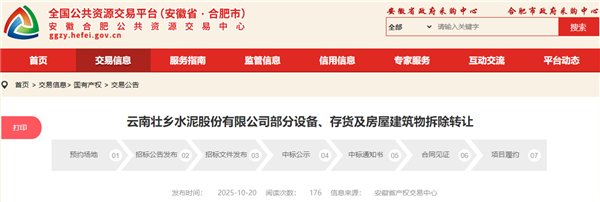 10月20日,安徽合肥公共資源交易中心發(fā)布云南壯鄉(xiāng)水泥股份有限公司部分設(shè)備、存貨及房屋建筑物拆除轉(zhuǎn)讓公告,掛牌時(shí)間截止至2025年10月31日,掛牌價(jià)格為899萬(wàn)元。