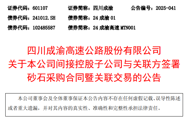 10月22日,四川成渝高速公路股份有限公司間接控股子公司——四川成渝興蜀供應(yīng)鏈管理有限公司(“興蜀供應(yīng)鏈公司”)與四川交建陵州建設(shè)有限公司(“交建陵州建設(shè)”)天眉樂高速公路項(xiàng)目LM項(xiàng)目經(jīng)理部簽署《砂石采購合同》,由興蜀供應(yīng)鏈公司向其供應(yīng)機(jī)制砂、碎石等砂石材料。供應(yīng)數(shù)量暫估為40萬噸,交易總金額預(yù)計(jì)不超過1億元(含稅)。
