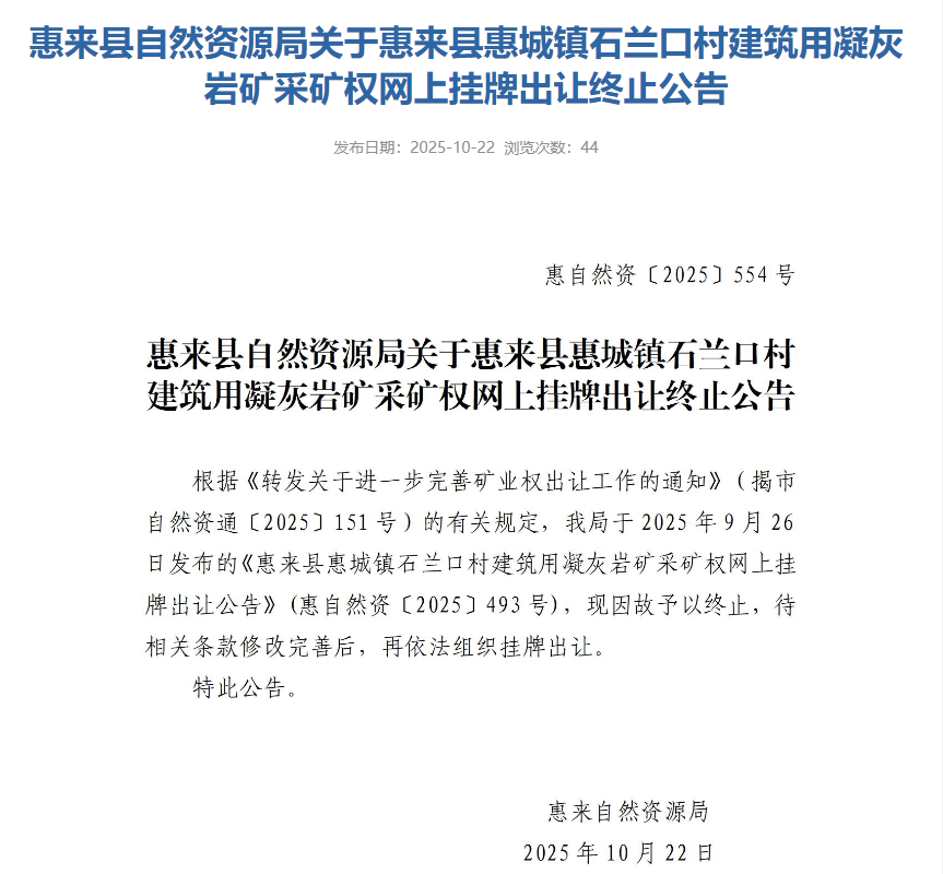近日,廣東省揭陽市惠來縣自然資源局發(fā)布《關(guān)于惠來縣惠城鎮(zhèn)石蘭口村建筑用凝灰?guī)r礦采礦權(quán)網(wǎng)上掛牌出讓終止公告》,根據(jù)公告內(nèi)容,2025年9月26日發(fā)布的《惠來縣惠城鎮(zhèn)石蘭口村建筑用凝灰?guī)r礦采礦權(quán)網(wǎng)上掛牌出讓公告》(惠自然資〔2025〕493號),因故予以終止,待相關(guān)條款修改完善后,再依法組織掛牌出讓。