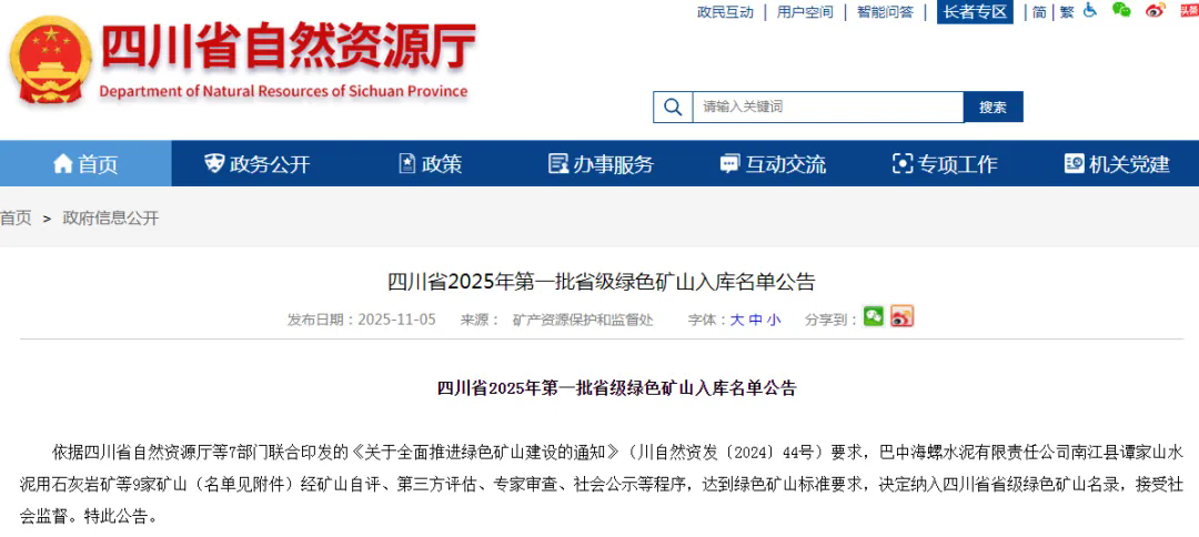 11月5日,自然資源廳發(fā)布四川省2025年第一批省級綠色礦山入庫名單公告。