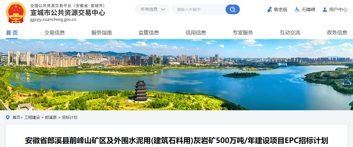近日,安徽省宣城市公共資源交易中心發(fā)布郎溪縣前峰山礦區(qū)及外圍水泥用(建筑石料用)灰?guī)r礦500萬噸/年建設項目EPC招標計劃。該項目投資金額2.8億元,礦山采礦建設生產(chǎn)規(guī)模為500萬噸/年,礦山設計總服務年限為17.05年,計劃招標時間2025年11月。