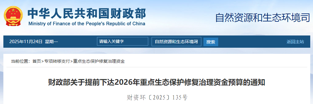 財政部關(guān)于提前下達2026年重點生態(tài)保護修復(fù)治理資金預(yù)算的通知