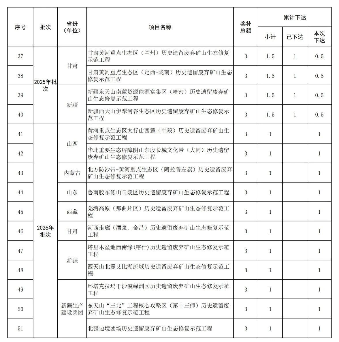 據(jù)悉,2026年重點生態(tài)保護修復(fù)治理(歷史遺留廢棄礦山生態(tài)修復(fù)示范工程)共涉及山西、內(nèi)蒙古、山東、西藏、甘肅、新疆、新疆生產(chǎn)建設(shè)兵團等7地區(qū),預(yù)算金額33億元,本次下達金額11億元。