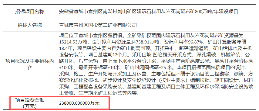 據(jù)悉,安徽宣城宣州區(qū)國(guó)投第二礦業(yè)有限公司以14.65億元的高價(jià)競(jìng)得該采礦權(quán)全礦采礦權(quán)范圍內(nèi)建筑石料用灰?guī)r花崗斑巖礦資源量為1.52億噸,年生產(chǎn)能力為800萬噸,礦山計(jì)算服務(wù)年限18.4年,項(xiàng)目投資金額23.8億元。