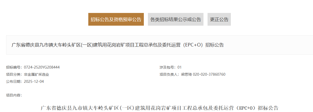 近日,廣東省德慶縣九市鎮(zhèn)大車嶺頭礦區(qū)(一區(qū))建筑用花崗巖礦項(xiàng)目工程總承包及委托運(yùn)營(EPC+O)招標(biāo),標(biāo)人為廣東誠安潤建新材料科技有限公司。該項(xiàng)目開采儲量建筑用花崗巖16582.68萬立方米,砂質(zhì)高嶺土254.81萬立方米(折合368.72萬噸)。