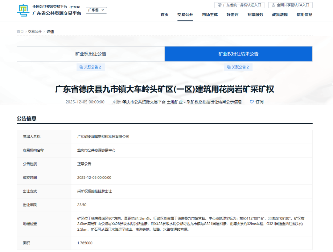 近日,肇慶市公共資源交易中心成功出讓廣東省德慶縣九市鎮(zhèn)大車嶺頭礦區(qū)(一區(qū))建筑用花崗巖礦采礦權(quán)。廣東誠安潤建新材料科技有限公司最終以底價(jià)16.13億元競得此礦。