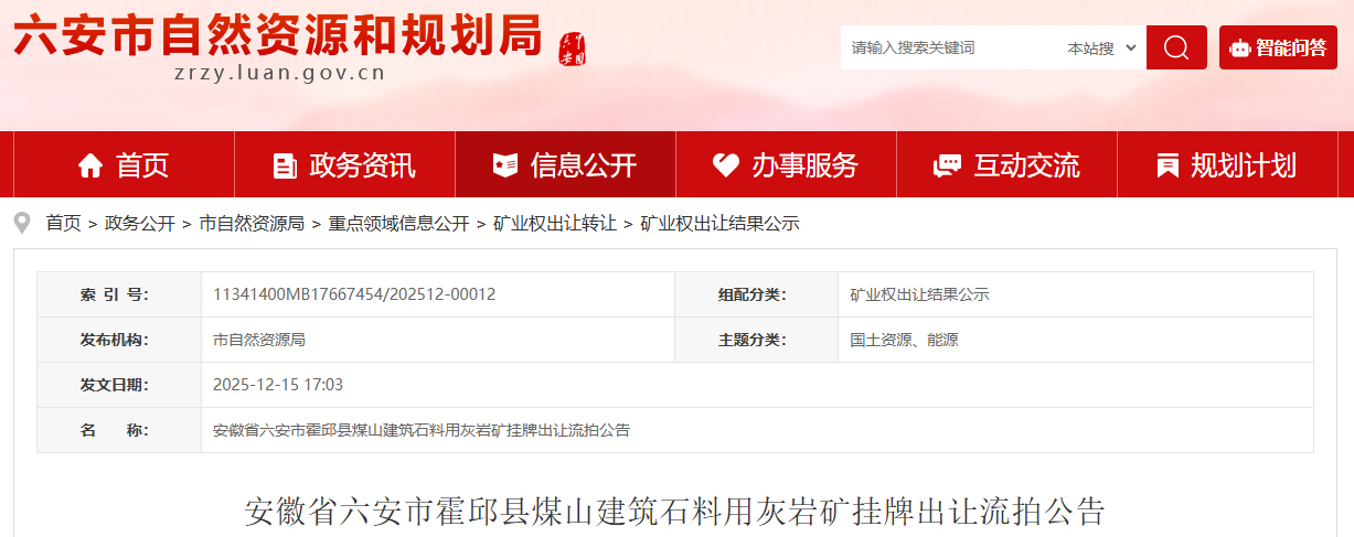 因安徽省六安市霍邱縣煤山建筑石料用灰?guī)r礦掛牌出讓項(xiàng)目截止報(bào)價(jià)前無(wú)競(jìng)買(mǎi)人報(bào)價(jià),根據(jù)《競(jìng)買(mǎi)須知》掛牌成交原則規(guī)定,六自然資礦掛告〔2025〕02號(hào)項(xiàng)目掛牌不成交,該項(xiàng)目流拍。