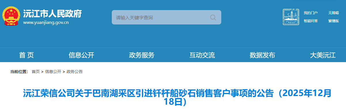 近日,沅江市人民政府發(fā)布沅江榮信公司關(guān)于巴南湖采區(qū)引進釬桿船砂石銷售客戶事項的公告。