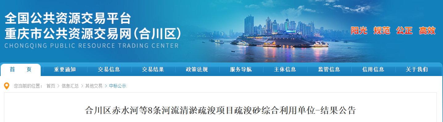 近日,重慶市公共資源交易中心發(fā)布重慶市合川區(qū)水利局對(duì)赤水河等8條河流清淤疏浚項(xiàng)目開展疏浚砂綜合利用單位結(jié)果公告。重慶江城水務(wù)有限公司(地方國企)以6.57億元拍得。項(xiàng)目涉及河段包括赤水河、打柴溝溪、大鰲溪、大沔溪、大蟠溪、上馬橋溪、龍?zhí)断安亟鹣?,清淤總方量約2638.21萬立方米,疏浚砂利用總量達(dá)1366.98萬立方米。