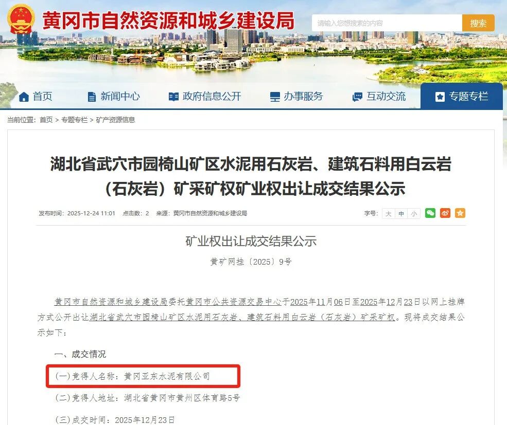 12月23日,黃岡亞?wèn)|水泥有限公司以4.27億元的價(jià)格,成功競(jìng)得湖北省武穴市園椅山礦區(qū)的采礦權(quán)。該礦區(qū)涵蓋水泥用石灰?guī)r、建筑石料用白云巖(石灰?guī)r)等多類(lèi)礦種,其中水泥用石灰?guī)r礦資源量達(dá)4161.4萬(wàn)噸,建筑石料用白云巖礦資源量18317.9萬(wàn)噸,建筑石料用石灰?guī)r礦資源量4807.4萬(wàn)噸,出讓年限長(zhǎng)達(dá)30年。值得注意的是,此次出讓資源不包含原采礦權(quán)人未消耗完的2390.2萬(wàn)噸水泥用灰?guī)r礦資源量。