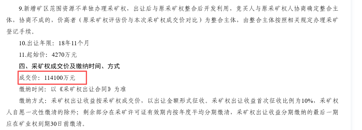 繳費(fèi)方式靈活,采礦權(quán)出讓收益首繳10%,可自愿一次性繳清全款,剩余部分按規(guī)分期繳納。目前成交結(jié)果正處于公示期,公示時(shí)間從2025年12月31日至2026年1月14日。