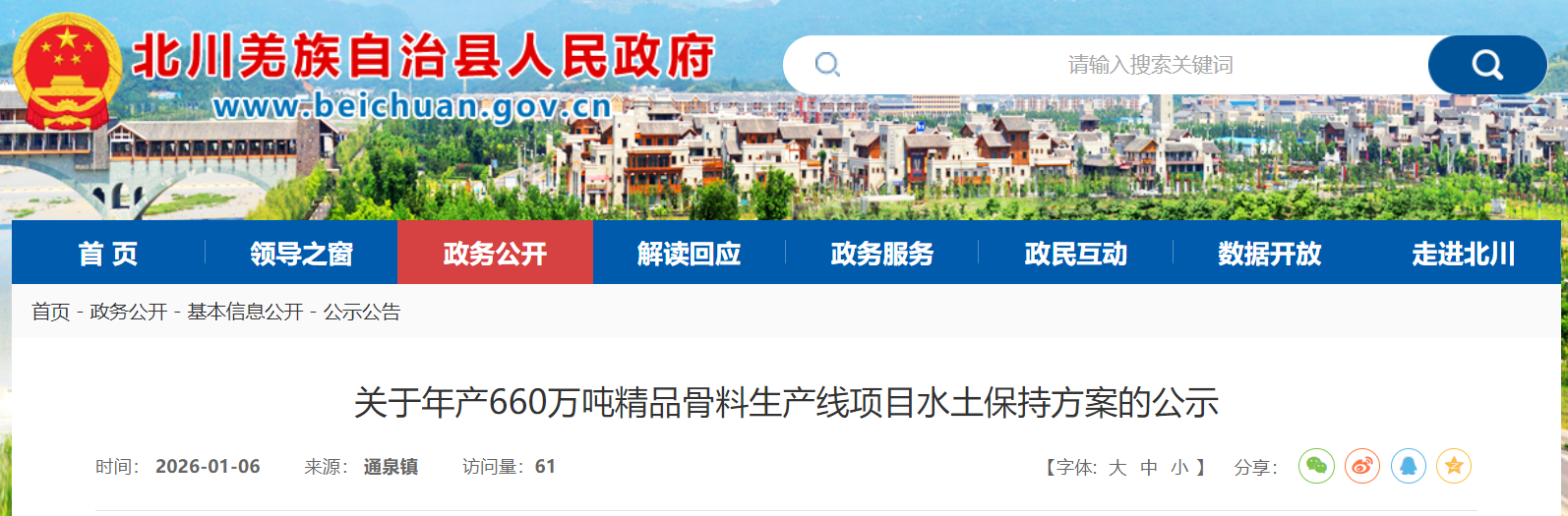 近日,四川北川羌族自治縣人民政府發(fā)布《關(guān)于年產(chǎn)660萬(wàn)噸精品骨料生產(chǎn)線項(xiàng)目水土保持方案的公示》。