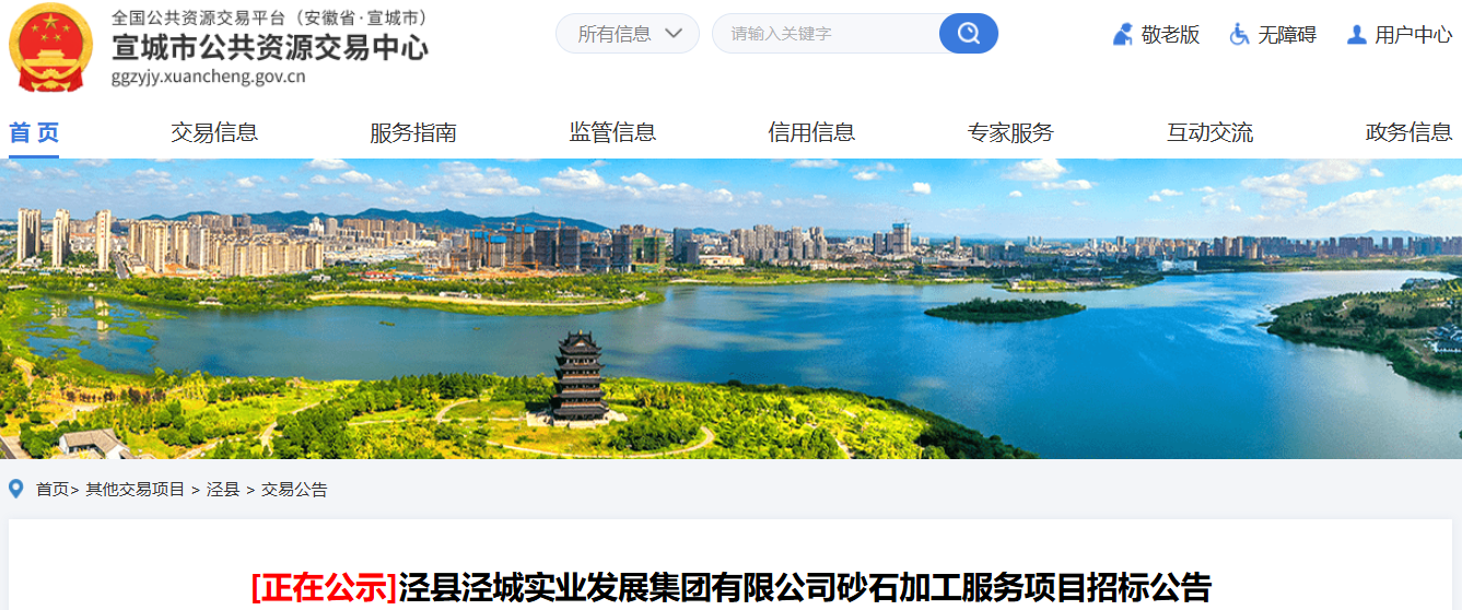 近日,安徽宣城公共資源交易中心發(fā)布涇縣涇城實業(yè)發(fā)展集團(tuán)有限公司砂石加工服務(wù)項目招標(biāo)公告。