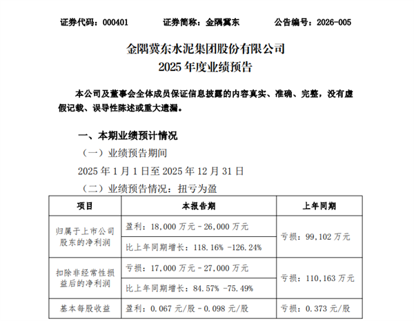 日前,金隅冀東水泥集團(tuán)股份有限公司發(fā)布2025年度業(yè)績預(yù)告。2025年,金隅冀東經(jīng)營狀況實現(xiàn)顯著改善,預(yù)計實現(xiàn)歸屬于上市公司股東的凈利潤1.8億元至2.6億元,較上年同期的虧損9.91億元成功實現(xiàn)扭虧為盈。