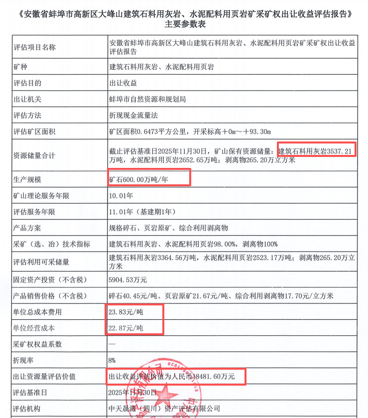 近日,安徽蚌埠市自然資源和規(guī)劃局公示高新區(qū)大峰山建筑石料用灰?guī)r、水泥配料用頁巖礦采礦權出讓收益評估報告。該項目評估價值約1.85億元,評估儲量約6700萬噸,設計生產(chǎn)規(guī)模600萬噸/年,擬出讓年限11年。單位總成本費用23.83元/噸,單位經(jīng)營成本22.87元/噸。
