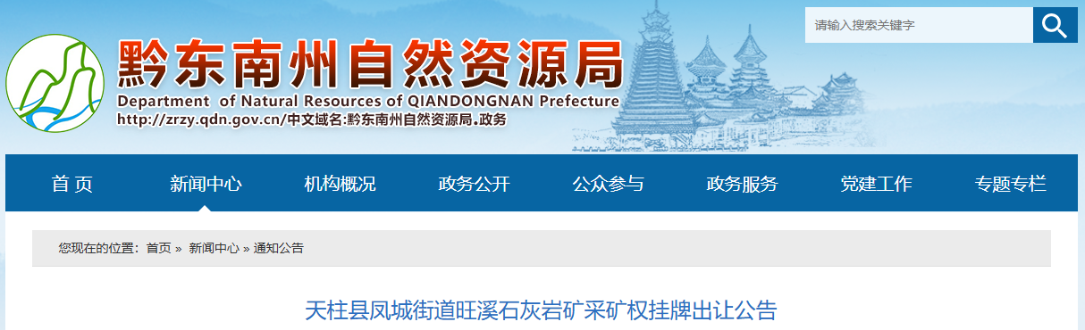 近日,貴州省黔東南州自然資源局發(fā)布天柱縣鳳城街道旺溪石灰?guī)r礦采礦權(quán)掛牌出讓公告。