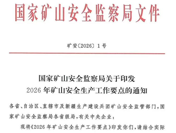 近日,國家礦山安全監(jiān)察局印發(fā)《2026年礦山安全生產(chǎn)工作要點》(礦安〔2026〕1號),以28條硬措施筑牢礦山安全防線。工作要點將托管責(zé)任界定、AI技術(shù)應(yīng)用、中小礦山升級等納入核心任務(wù),圍繞事前預(yù)防轉(zhuǎn)型、本質(zhì)安全提升主線,對非煤礦山安全生產(chǎn)作出全面部署,給砂石、水泥等非煤礦山企業(yè)劃定了全年安全工作的“硬標(biāo)尺”。
