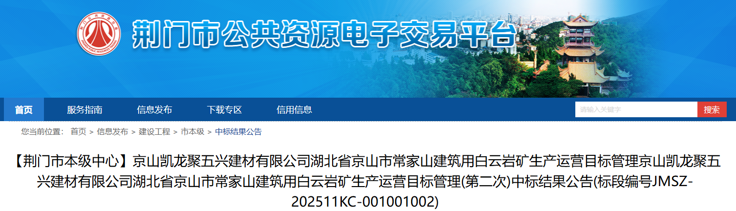 湖北荊門市公共資源電子交易平臺發(fā)布京山凱龍聚五興建材有限公司湖北省京山市常家山建筑用白云巖礦生產運營目標管理(第二次)中標結果公告。湖北凱龍工程爆破有限公司、京山市恒翔建材有限..