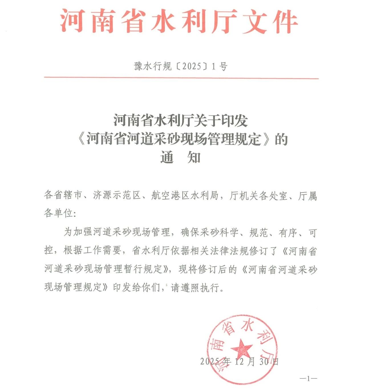 為適應(yīng)新形勢下河道采砂管理需求,進(jìn)一步規(guī)范采砂現(xiàn)場作業(yè),保障河勢穩(wěn)定、防洪安全與生態(tài)健康,河南省水利廳于近日正式印發(fā)《河南省河道采砂現(xiàn)場管理規(guī)定》(以下簡稱《規(guī)定》),并宣布該規(guī)定自2026年2月1日起施行,2018年發(fā)布的暫行規(guī)定同時(shí)廢止。