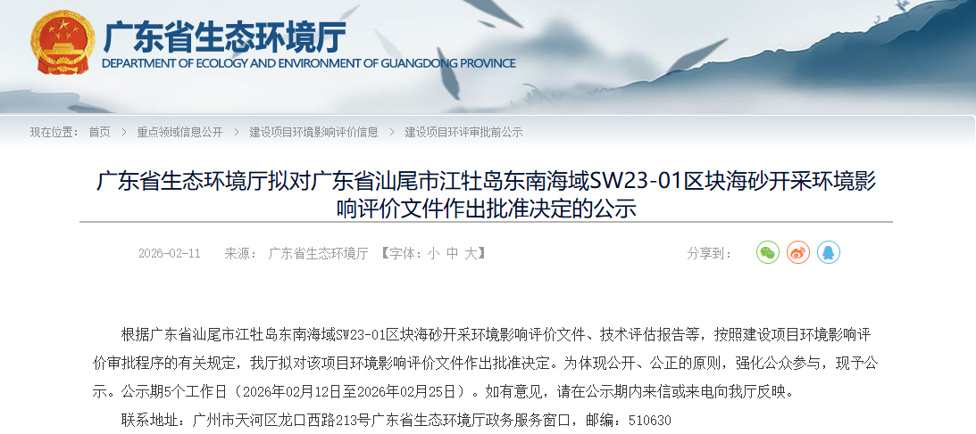 廣東省生態(tài)環(huán)境廳發(fā)布擬對廣東省汕尾市江牡島東南海域SW23-01、SW23-02區(qū)塊海砂開采環(huán)境影響評價文件作出批準決定的公示。兩塊礦區(qū)可采海砂儲量超2842.82萬方,年產可達1300萬方。