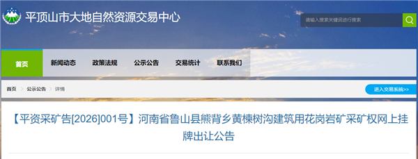 根據(jù)公告,該礦掛牌時(shí)間為2026年3月15日至2026年3月27日。競(jìng)得人需按照《河南省魯山縣熊背鄉(xiāng)黃楝樹溝建筑用花崗巖礦礦產(chǎn)資源開采與生態(tài)修復(fù)方案》進(jìn)行礦產(chǎn)資源開采,必須嚴(yán)格按照相關(guān)行業(yè)綠色礦山建設(shè)標(biāo)準(zhǔn)要求進(jìn)行規(guī)劃、設(shè)計(jì)和運(yùn)營(yíng)管理,建成綠色礦山,實(shí)行邊開采邊治理。