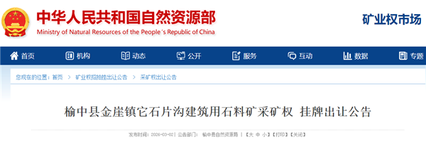 該采礦權(quán)位于榆中縣金崖鎮(zhèn)豆家峴村,掛牌時(shí)間為2026年3月31日至2026年4月14日。競(jìng)得人在取得采礦權(quán)后,嚴(yán)格遵守礦產(chǎn)資源法律法規(guī)、相關(guān)礦業(yè)權(quán)管理政策,依法有效保護(hù)、合理開(kāi)采、綜合利用礦產(chǎn)資源,依法保護(hù)生態(tài)環(huán)境。按照國(guó)家和甘肅省綠色礦山建設(shè)標(biāo)準(zhǔn)和要求,積極推進(jìn)綠色礦山建設(shè)。