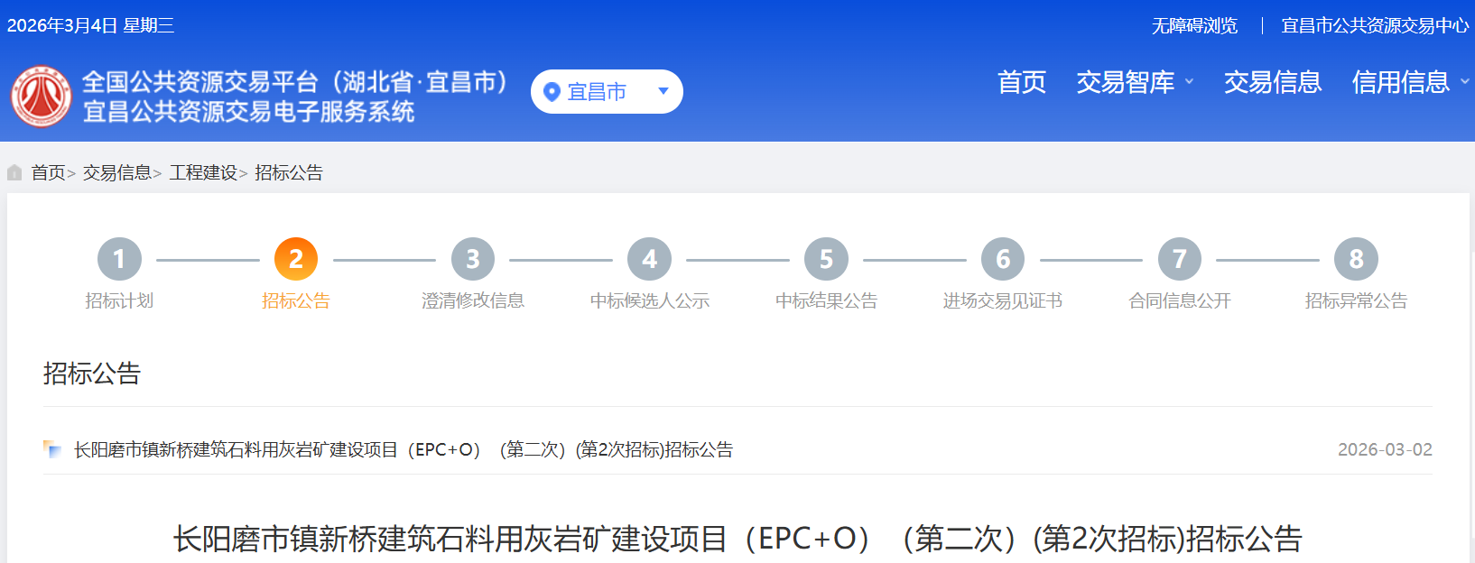 近日,湖北宜昌公共資源交易電子服務(wù)系統(tǒng)發(fā)布《長陽磨市鎮(zhèn)新橋建筑石料用灰?guī)r礦建設(shè)項(xiàng)目(EPC+O)(第二次)(第2次招標(biāo))招標(biāo)公告》因原中標(biāo)聯(lián)合體主動(dòng)放棄合作,雙方已正式解除合同,原招標(biāo)程序所對應(yīng)的合同關(guān)系已終止,經(jīng)行業(yè)監(jiān)督部門同意本項(xiàng)目重新招標(biāo)。