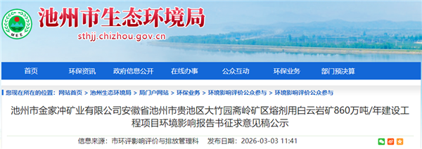 3月3日,安徽省池州市生態(tài)環(huán)境局發(fā)布池州市貴池區(qū)大竹園齋嶺礦區(qū)熔劑用白云巖礦860萬噸/年建設(shè)工程項(xiàng)目環(huán)境影響報告書征求意見稿公示。該項(xiàng)目資源總量超2億噸,擬出讓年限25.2年。