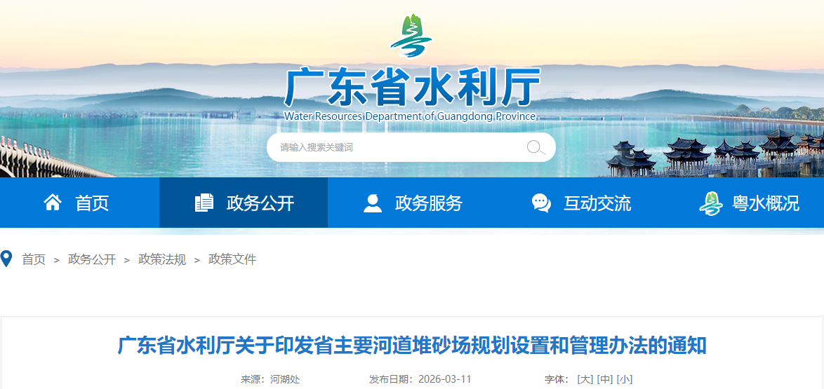 據(jù)了解,《辦法》自2026年5月1日施行,適用于廣東省內(nèi)主要河道管理范圍內(nèi)堆砂場的規(guī)劃、設(shè)置、運營及監(jiān)管工作,其他河道可參照執(zhí)行,核心圍繞堆砂場規(guī)劃編制、禁設(shè)區(qū)域劃定、申報審批流程、運營管理規(guī)范、監(jiān)管責(zé)任落實等方面作出明確規(guī)定,補齊河道堆砂場管理短板,杜絕違規(guī)設(shè)場、無序堆存、污染環(huán)境等問題。