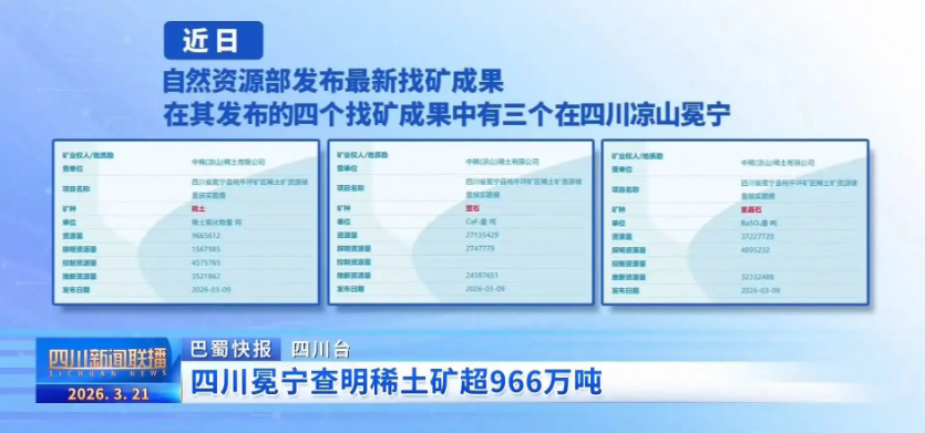 近日,自然資源部發(fā)布最新找礦成果。在其發(fā)布的四個找礦成果中,有三個在四川涼山冕寧,分別是:966.56萬噸稀土氧化物、2713.54萬噸超大型螢石、3722.77萬噸重晶石,進一步夯實了我省戰(zhàn)略性礦產(chǎn)的資源“家底”。