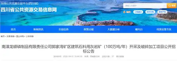 4月1日,四川省公共資源交易信息網(wǎng)發(fā)布南漳龍蟒磷制品有限責(zé)任公司湖北襄陽郭家灣礦區(qū)建筑石料用灰?guī)r礦(100萬噸/年)開采及破碎加工項(xiàng)目公開招標(biāo)公告。項(xiàng)目投資額約6000萬元,計(jì)劃開采期1095日歷天,計(jì)劃2026年4月開工。投標(biāo)截止時(shí)間為2026年4月23日。
