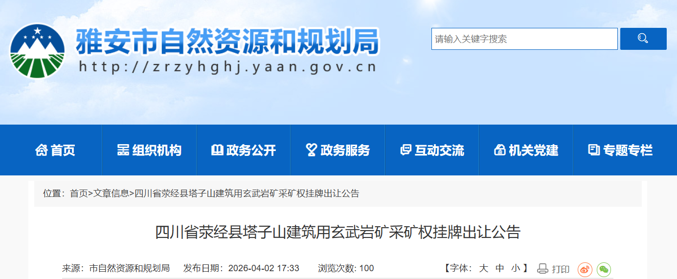 近日,受四川雅安市自然資源和規(guī)劃局委托,雅安市政務(wù)服務(wù)和公共資源交易服務(wù)中心發(fā)布公告,將對(duì)四川省滎經(jīng)縣塔子山建筑用玄武巖礦采礦權(quán)實(shí)施掛牌出讓。本次出讓起始價(jià)為4.8億元人民幣,掛牌時(shí)間為2026年5月8日至5月21日。