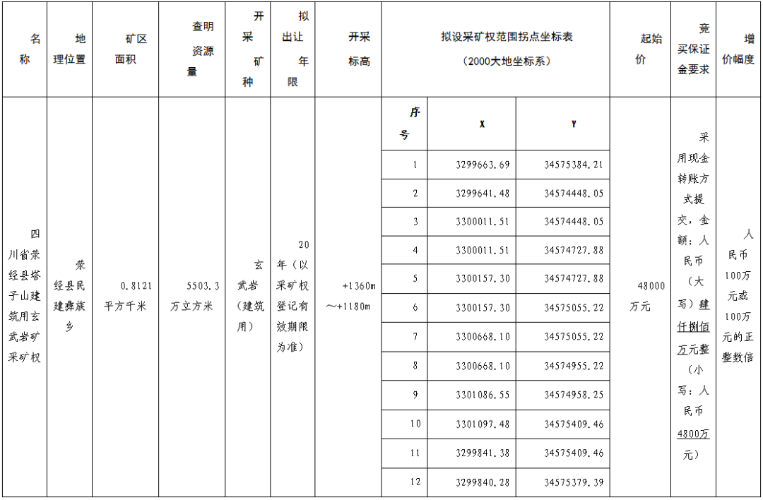 本次采礦權(quán)出讓采用有底價(jià)增價(jià)掛牌方式,按照價(jià)高者得的原則確定競(jìng)得人。掛牌時(shí)間為2026年5月8日至2026年5月21日,現(xiàn)場(chǎng)交易地點(diǎn)位于雅安市政務(wù)服務(wù)和公共資源交易服務(wù)中心(雅安市雨城區(qū)雅州大道456號(hào)B區(qū)二樓開(kāi)標(biāo)廳)。
