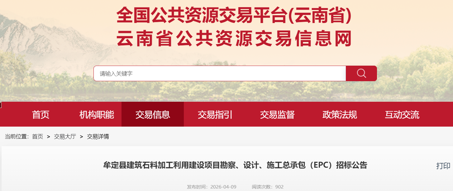 近日,云南省公共資源交易信息網(wǎng)發(fā)布牟定縣建筑石料加工利用建設(shè)項(xiàng)目勘察、設(shè)計(jì)、施工總承包(EPC)招標(biāo)公告。該項(xiàng)目計(jì)劃總投資約9896.12萬(wàn)元,招標(biāo)人為云南齊凱建設(shè)工程有限公司。