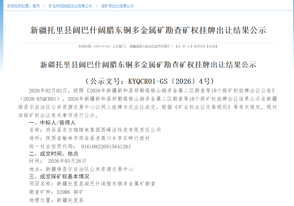 新疆自然資源廳最新公示:新疆托里縣闊巴什闊臘東銅多金屬礦探礦權成功出讓!該探礦權起始價僅29.76 萬元,最終以10105.76 萬元成交,溢價率高達33852%,創下近期新疆礦業權出讓市場的亮眼紀錄。競得方為府谷縣東方瑞煤電集團西峰活性炭有限責任公司,標志著陜西能源化工巨頭正式進軍新疆戰略性礦產資源領域。